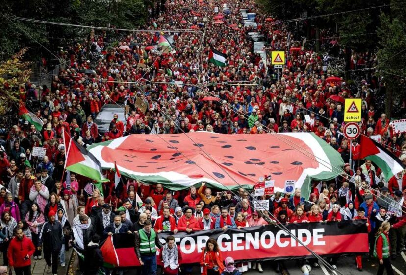 Borden met foto’s van Pim Fortuyn en Theo van Gogh steken boven de menigte uit. Eén demonstrant houdt een bord omhoog waarop ‘Palingpopulist’ staat – een duidelijke verwijzing naar Jesse Klaver, die deze week Mona Keijzer zo noemde in een tv-debat.