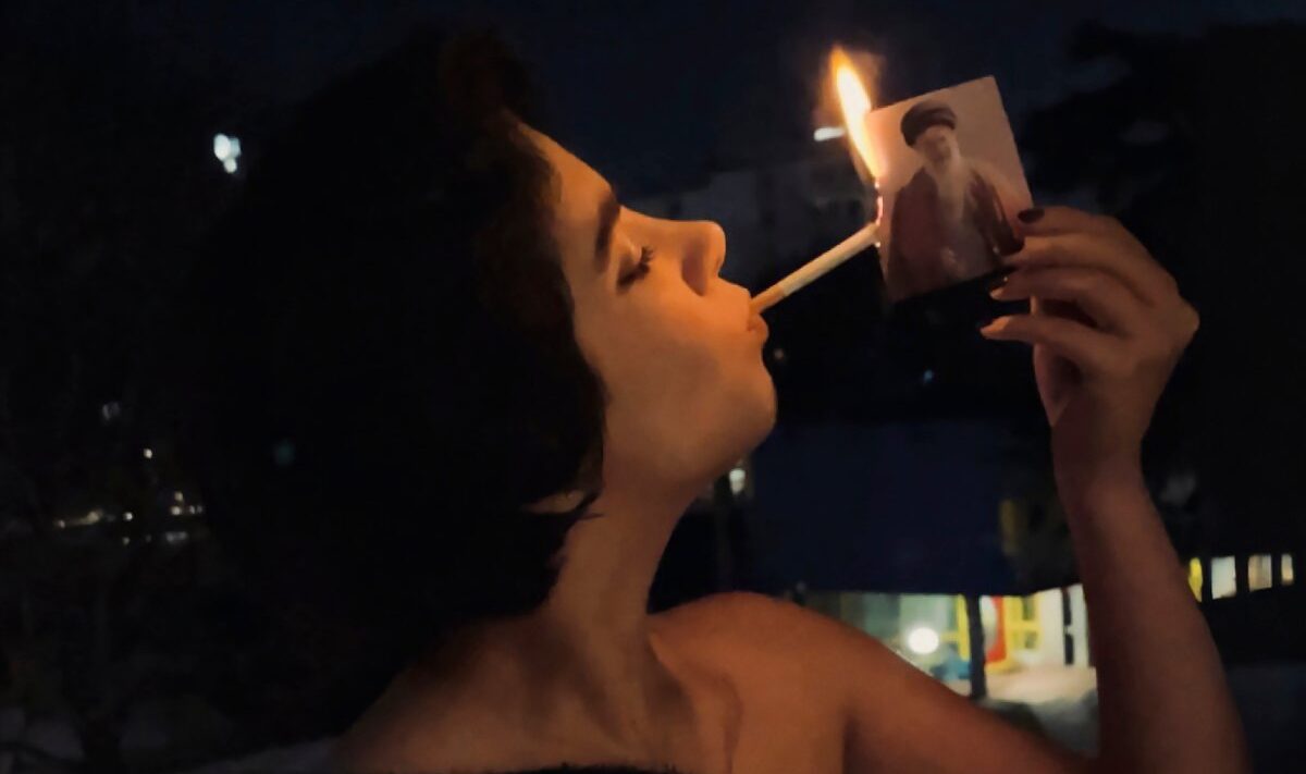 Iraanse opstandeling verbrandt foto ayatollah met sigaret.