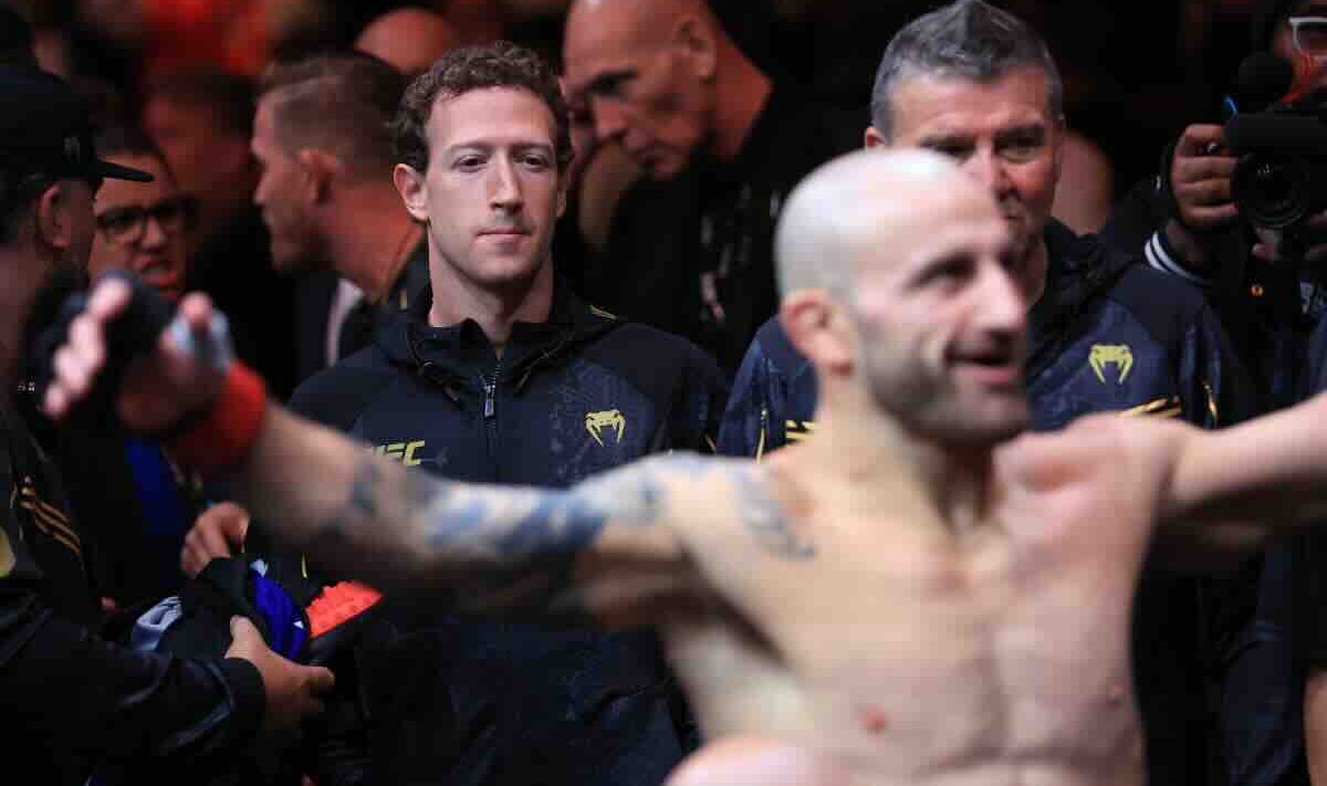 Het is chaos rond de vechtkooi. Daar in het felle licht staat Mark Zuckerberg. Gehuld in een Team Volkanovski-trainingspak, strak gesloten, alsof hij op het punt staat zelf de UFC-ring in te stappen. Alexander Volkanovski, de Australische kampioen die hij begeleidt, begint scherp.