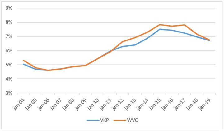 Figuur 1: Procentuele leegstand (VKP = VerKoopPunten, WVO, is WinkelVloerOppervlakte)