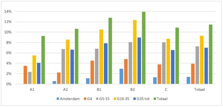 Figuur 2: Leegstand naar segment, locatie en naar grootte van de stad, 2019