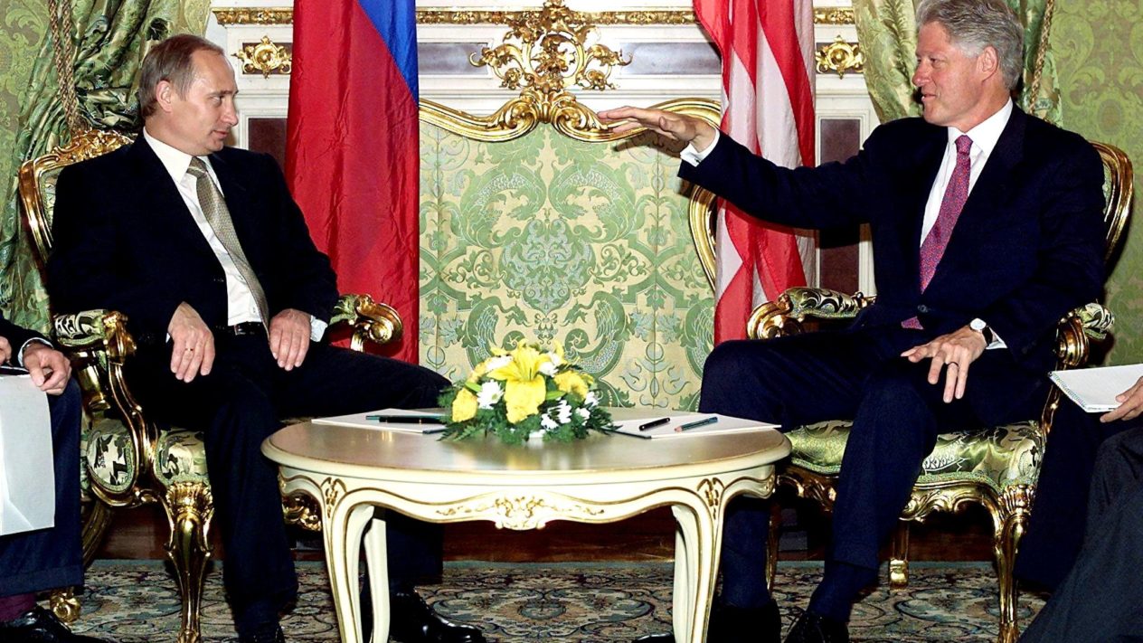 ‘President Jeltsin leidde Rusland naar vrijheid. Onder president Poetin heeft Rusland de kans op welvaart en kracht, terwijl het de rechtsstaat respecteert,’ zei Clinton in Rusland. Na de roerige jaren negentig klonk de hoop op het einde van de geschiedenis door in Clintons woorden, al had die ook twijfels. Tegen Poetin zei hij: ‘We zijn niet bestemd om vijanden te zijn, maar er is geen garantie dat we bondgenoten worden.’
