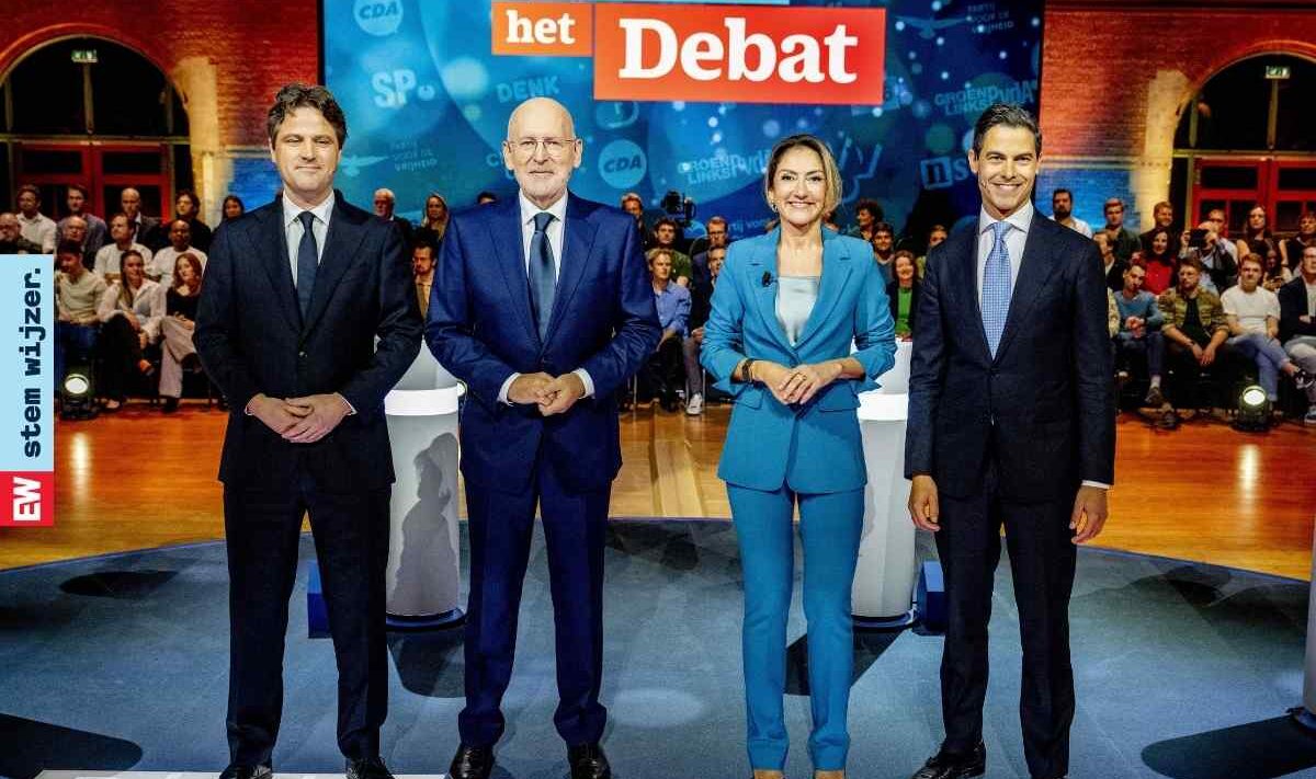 Zo stonden uiteindelijk Henri Bontenbal (CDA), Rob Jetten (D66), Frans Timmermans (GroenLinks-PvdA) en Dilan Yeşilgöz (VVD) tegenover elkaar.